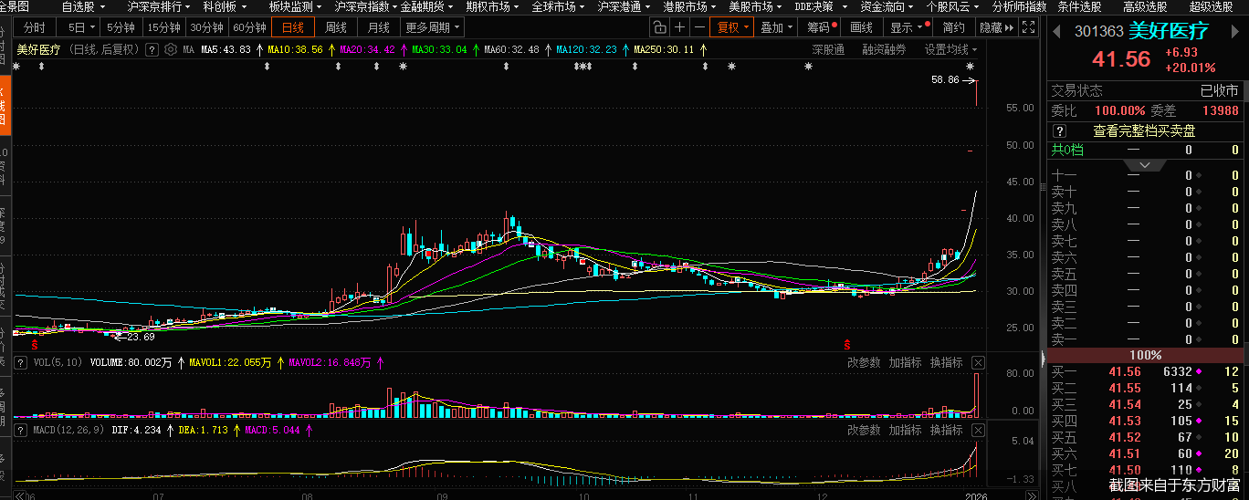 在上述消息影响下,1月5日—6日,人脑工程板块掀起涨停潮,多只个股连续两个交易日“20cm”涨停。1月7日,美好医疗再度“20cm”涨停,南京熊猫、岩山科技等个股斩获三连板。爱朋医疗、麦澜德、伟思医疗等个股则出现回调,其中爱朋医疗跌逾11%。