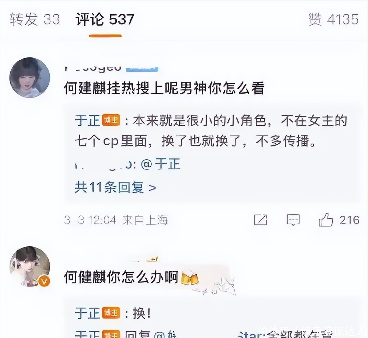 但于正反应迅速,在舆论发酵后立即宣布换角,称其为“很小的男配角色”,并强调该角色“不在女主七个CP之列”。