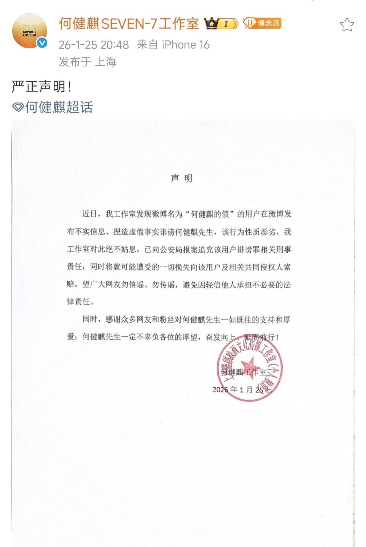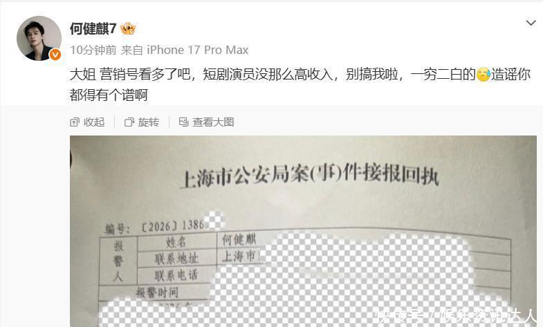 事发后,何健麒第一时间通过工作室发布声明,否认举报内容。他本人也通过微博发声,称对方是营销号看多了,短剧演员没那么高收入,一穷二白的造谣也得有个谱,并晒出了报警回执单。